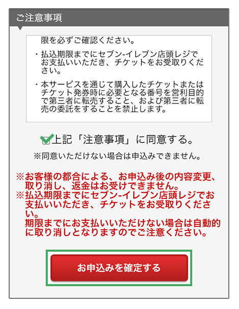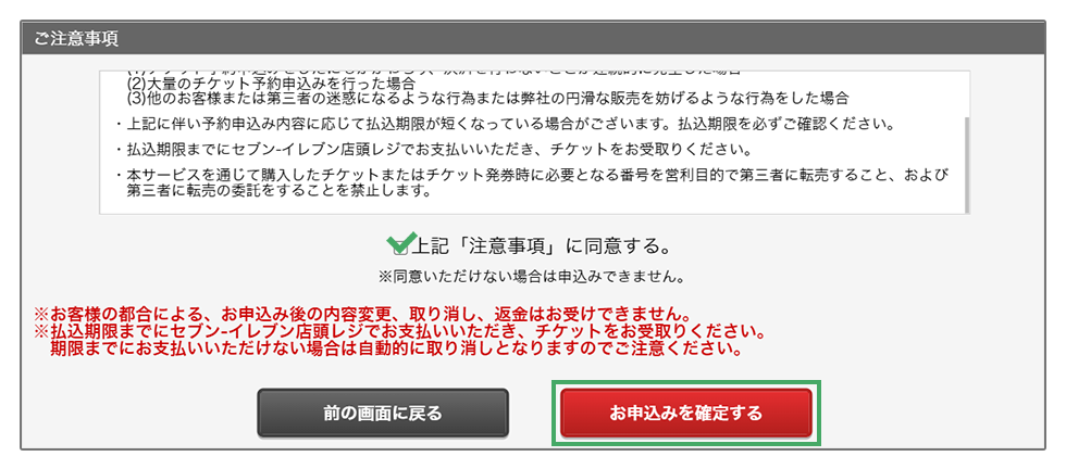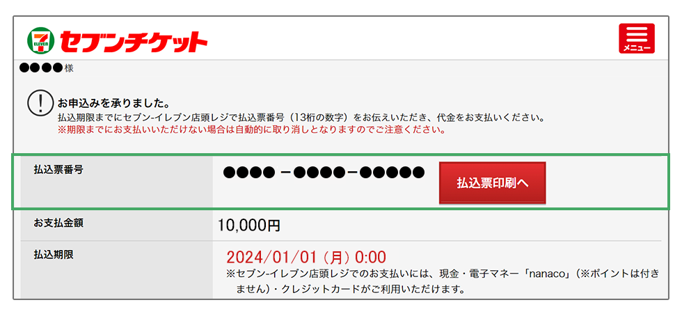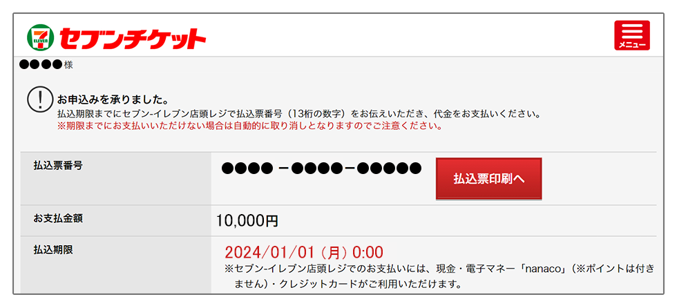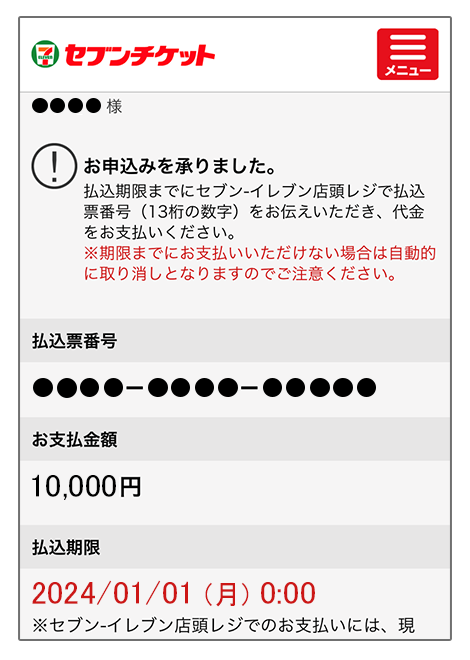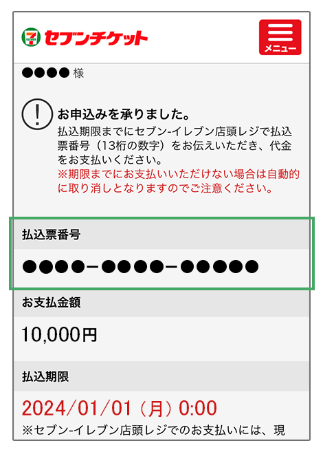 2払込期限までにセブン-イレブン店頭レジで「払込票番号(13桁の数字)」を伝え、代金を支払いチケットを受け取る